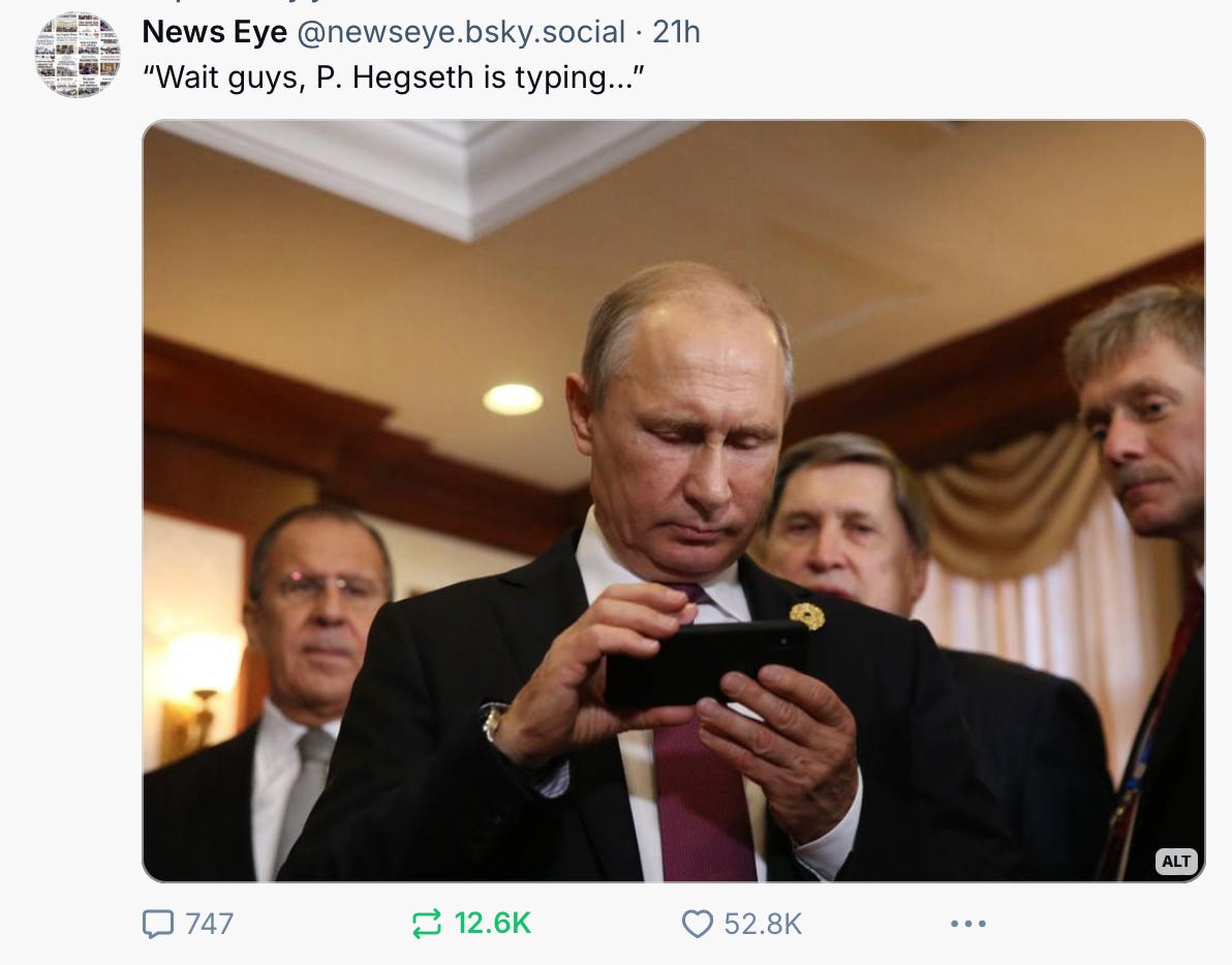 And just as this was about to go out, The Atlantic went ahead and published the full text chain. It’s not a good look for our national security stewards. Aside from the weapons info and strike schedule, the text chain is a goldmine of policy discussions, who thinks what about whom and what policies. Any intelligence agency would love to see it (and any case officer that collected it would be given much more than just a gift certificate to the Cheesecake Factory). And again, Witkoff was in Moscow, and Gabbard was…we don’t know where. How compromised are these guys and their phones? We can’t say for sure, but not doubt, our adversaries are rubbing their hands together with glee.